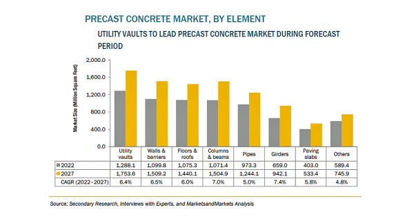 プレキャストコンクリートの市場規模は、2022年の1446億米ドルからCAGR6.6%で成長し、2027年には1989億米ドルに達すると予測されています。プレキャストコンクリートは、100%リサイクル可能な天然建材であり、鉄と組み合わせることで耐震性があり、持続可能かつ消耗が少ない材料です。現代のプレキャストコンクリート工場は、マスターコンピューターで制御、監視されており、セメント、建設用鋼材、水などの必要量を計算し、最適な材料利用を可能にすることで、資源の節約を実現しています。