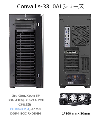 株式会社クォーレスト(本社:東京都世田谷区 代表取締役:黒川博生)では、水冷化されたシングル第3世代Xeon SP (LGA-4189, 64レーン) CPU, C621A PCH, DDR4 ECC R-DIMMを搭載し、4*M.2 NVMe SSD によるVROC RAID, NVIDIA SLIによるマルチGPUをサポートしたワークステーション「Convallis-3310AL」シリーズ と、GPUの水冷化も可能な「Convallis-3310ALx」シリーズの販売を、2022年8月下旬より開始いたします。