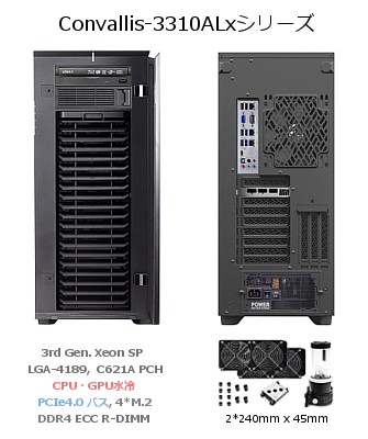 Convallis-3310Aシリーズは、2基のLGA-4189ソケット(ソケットP+)3世代 Intel Xeon SP(64レーン, TDP≦270W)CPUを水冷化したワークステーションで、6台の3.5/2.5インチドライブと2台の2.5インチドライブが実装可能です。フロントドアは、左開き、右開きでの運用、取り外しての運用が可能です。