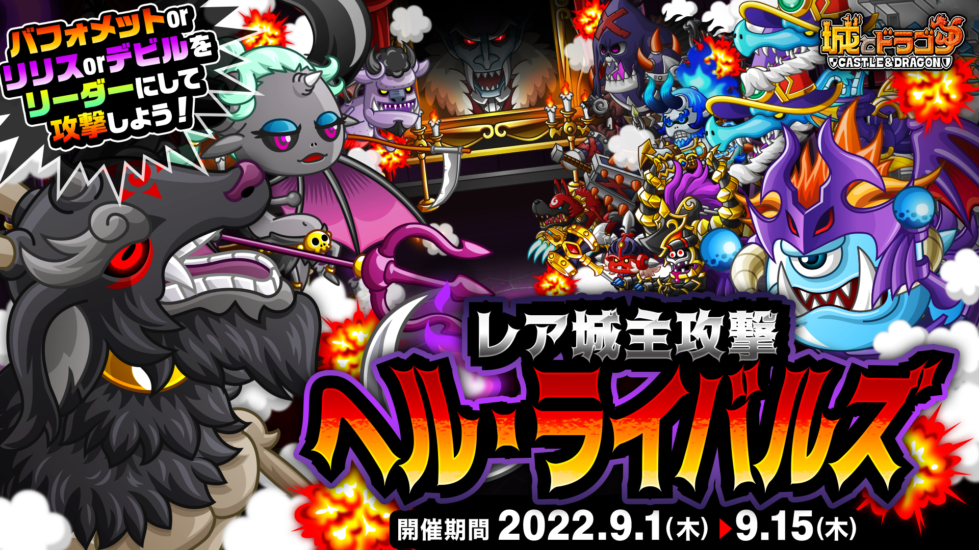 「バトル」から「ひとりで」または「みんなで」を選んで「攻撃」を選択すると、ランダムでレア城主が出現する“レア城主イベント”に「ヘル・ライバルズ」が登場。見事勝利すれば、豪華報酬を獲得することができます。