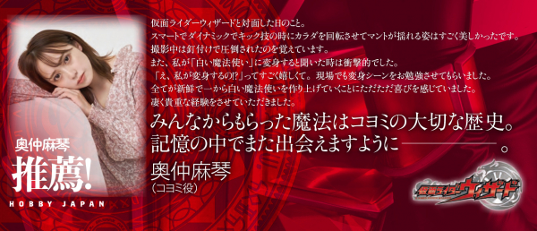 仮面ライダーウィザード、仮面ライダービーストの全スタイルをはじめ、仮面ライダーソーサラー、仮面ライダーワイズマン(白い魔法使い)、白い魔法使い(コヨミ)、仮面ライダーメイジ(真由)など、作品に登場したすべての仮面ライダーとアイテムを撮り下ろし!各キャラクターのスーツアクターは高岩成二、渡辺淳、永徳、藤田慧といった、TV・映画と同じキャスティグとなっております。