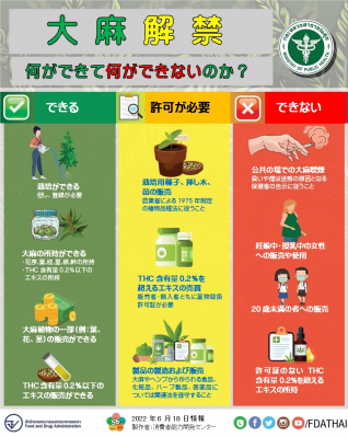 日本臨床カンナビノイド学会(事務局:東京都品川区)では、タイ保健省の大麻広報サイトのインフォグラフィックで、大麻解禁で何ができて何ができないのかをわかりやすく描いたポスターがありましたので、それを翻訳し、本日付けで当プレスリリースにて公表しました。但し、本年6月18日時点での情報であり、古くなると状況が変わる可能性があることにご注意ください。