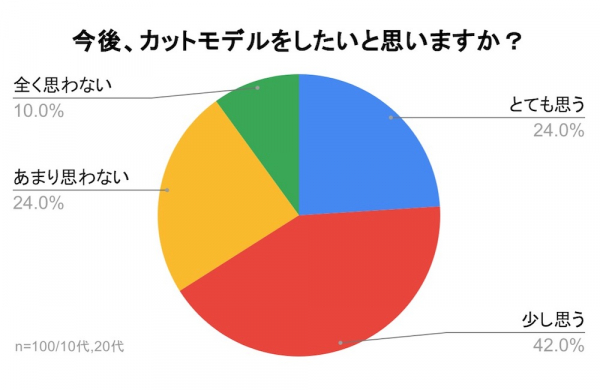 「今後、カットモデルをしたいと思いますか?」の質問では、『とても思う』が24%、『少し思う』が42%、『あまり思わない』が24%、『全く思わない』が10%という結果となり、66%と多くの方がカットモデル利用に前向きであるということがわかりました。