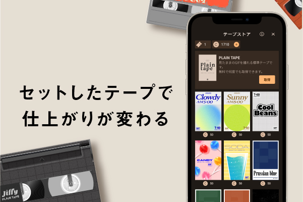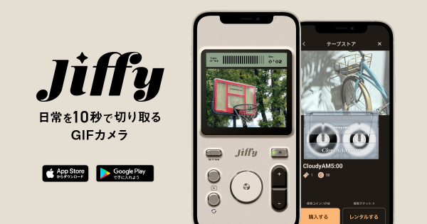 jiffyは、1カット10秒以内でGIF動画を撮るカメラアプリです。 テープを替えることで、さまざまな色や質感のGIFが撮影できます。