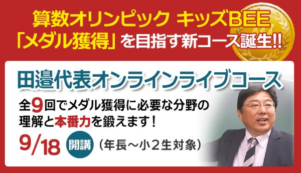 今秋開講するオンラインライブコースでは、2023年6月の算数オリンピックキッズBEE大会に向けて、全9回(+α)でメダル獲得に必要な分野の理解を深め、本番でどのような問題にも対応できる力を身につけていきます。講義はりんご塾代表の田邉先生が直接行い、対策問題は田邉先生がこの講座のために作成した完全オリジナルです。