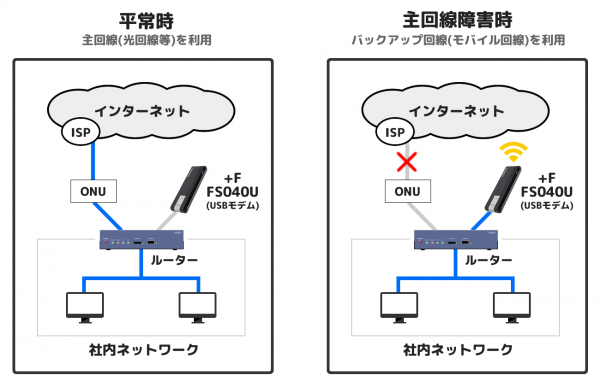 この「+F FS040U」は、通常時に使用する光回線などとは通信経路が異なる、モバイル回線を利用するので、いざという時の回線として適しております。