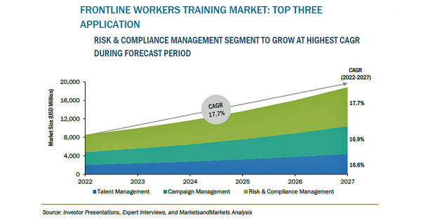 フロントラインワーカーのトレーニングの市場規模は、2022年の189億米ドルからCAGR16.2%で成長し、2027年には401億米ドルに達すると予測されています。最前線のパフォーマンスを向上させるためのスキルベースの客観的なトレーニングのニーズの高まりや、最前線の労働者のためのインタラクティブでパーソナライズされたトレーニング環境を統合するニーズなどの要因が、同市場の成長を後押ししています。