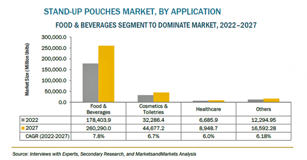 スタンドアップパウチの市場規模は、2022年の248億米ドルからCAGR8.1%で成長し、2027年には367億米ドルに達すると予測されています。健康意識の高まりと一人当たりの所得向上により、包装された食品・飲料の需要が増加し、スタンドアップパウチの需要を牽引しています。