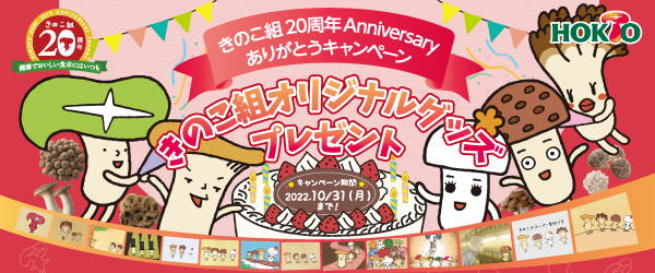 きのこ総合企業のホクト株式会社(所在地:長野県長野市、代表取締役社長 水野雅義)では、ホクトのキャラクター“きのこ組”が誕生してから20周年を迎えるにあたり、皆さまへ感謝の気持ちを込めて、「きのこ組20周年Anniversaryありがとうキャンペーン」を2022年9月11日(日)から同10月31日(月)まで開催します。