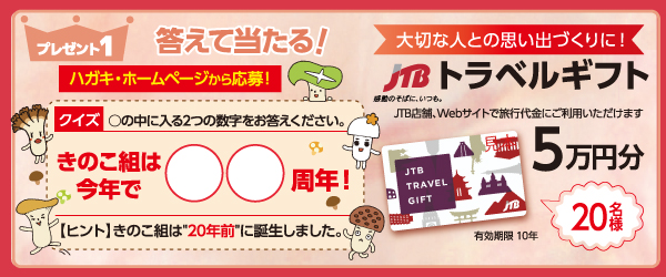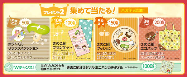 クイズに答えて当たるコースでは、JTBトラベルギフト5万円分が20名様に。また、ホクトのきのこのパッケージに付いているHOKTOマークを必要枚数分集めて応募するコースでは、「ホクトくんリラックスクッション」が50名様に。「きのこ組ブランケット」が100名様に。「きのこ組クッション」が150名様に。「きのこ組エコバッグ」が200名様に当たります。外れてしまってもWチャンスで「きのこ組オリジナルミニハンカチタオル」を1,000名様にプレゼントします。