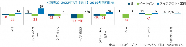 外食・中食市場の2022年7月は、売上7.9%減(2019年同月比)
