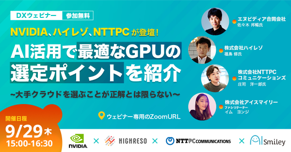 DXを加速させるAIポータルメディア「AIsmiley」を運営するアイスマイリー(東京都渋谷区、代表取締役:板羽晃司)は、2022年9月29日(木)15時から「最適なGPUの選定ポイント」をテーマにウェビナーを開催します。