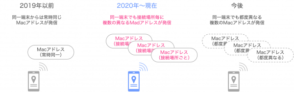 Digital東京を始めとするスマートフォンが自発的に送信するWi-Fiの信号を使った各種分析サービスは、従来スマートフォンごとにユニークであったMacアドレスと呼ばれる識別子を用いていました。しかしながらさまざまな要因からApple社やGoogle社といったスマートフォンのOSを提供する各社が数年前よりそのMacアドレスを識別子としては使えないようにするいわゆる「Macアドレスのランダム化」を始めました。そのため、Macアドレスを利用した詳細分析は事実上不可能となっています。