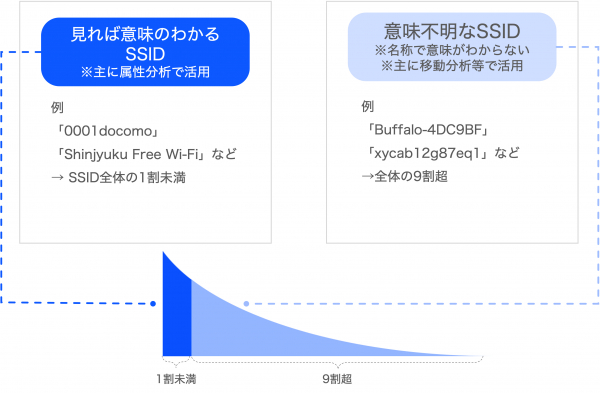 SSID(Service Set Identifier)とはWi-Fiのアクセスポイントに付けられた名前です。最近はカフェなどに行くとフリーWi-FiのSSIDが掲示されてるのをよく目にするようになりました。このSSIDは例えば”Oxyzen_guest”のような、見れば意味のわかるSSID(この場合は「Oxyzen社オフィスのゲスト用のSSID」と考えられる)と、例えば"AP-4DC9BF"のような意味不明なSSIDに大きく2種類に分けることができます。前者は企業や店舗などが「見れば何のアクセスポイントのSSIDなのか把握できるように」名付けたSSIDであり、後者は「市販のアクセスポイントの初期値のSSIDのように名前自体に特に意味がない」SSIDです。