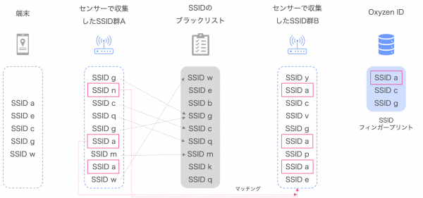 この意味不明なSSIDは例えば家のアクセスポイントのSSIDだったり、ポケットWi-FiのSSIDであったりしますが、それらの大半はその家の家族やごく限られた人だけでシェアされています。そしてその意味不明なSSIDの時刻的な近傍に、例えばいつも会社のSSIDが出現した場合、複数のSSIDをグループ(指紋、フィンガープリント)として捉えることでMacアドレスに代わるユニークなID("Oxyzen ID"と呼びます)を付与することができます。