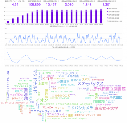ダッシュボードでは10分毎、時間帯別、日次のカウント数や滞在時間、再訪問率、再訪問のインターバルなどの分析が可能で、また距離による範囲指定も可能です。