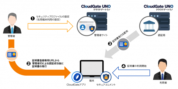 CloudGate証明書では、秘密鍵の生成や安全な保存の機能を持つ、端末搭載のセキュアエレメント(TPMなど)を利用することで安全な証明書配布方法を実現いたしました。