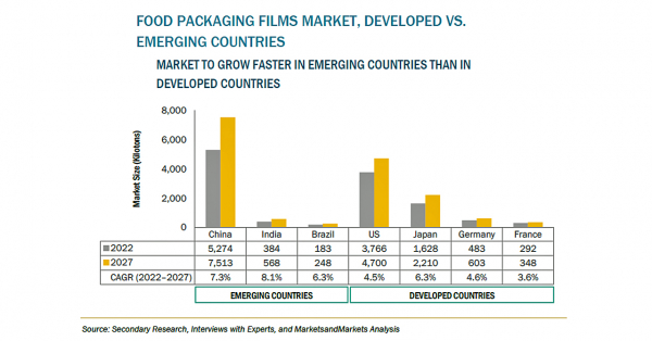 食品包装用フィルムの市場規模は、2021年の498億米ドルからCAGR6.4%で成長し、2027年には723億米ドルに達すると予測されています。食品・飲料用包装は、包装業界の最大セグメントの1つで、パッケージングは、製品の鮮度を保ち、ダメージを与えないという重要な役割を果たすとともに、効率的なマーケティングツールとしての役割も果たしています。食品包装用フィルム市場は、業界の成長と連動して成長してきました。