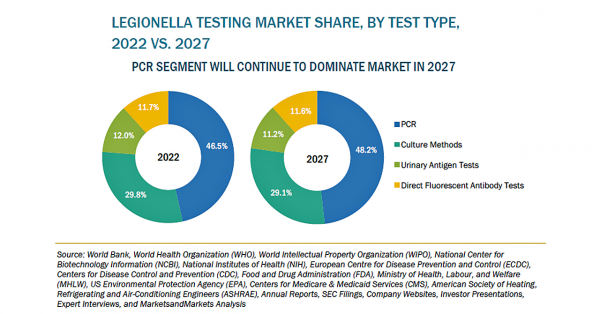 レジオネラ菌検査の市場規模は、2022年の2億9600万米ドルからCAGR8.2%で成長し、2027年には4億3900万米ドルに達すると予測されています。市場成長の原動力は、レジオネラ関連疾患の有病率上昇と相まって、高齢者人口が増加していることと、迅速な診断に対する需要が高まっていることが挙げられます。