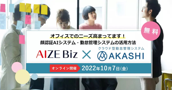去る7月20日より、トリプルアイズの顔認証AI・AIZE Biz(アイズビズ)は、ソニービズネットワークスが提供するクラウド型勤怠管理システム「AKASHI」とのAPIによるサービス連携を開始いたしました。この連携により、「AIZE Biz」をご利用中の企業は、「AKASHI」の持つ多彩で高度な勤怠管理機能を活用することができるようになり、業務効率化と経営改善を進めることができます。
