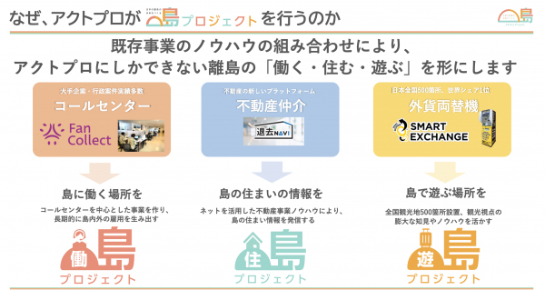 島プロジェクトでは離島に「働く・住む・遊ぶ」の3つを創出し、定住人口、交流人口の増加や経済活性化への貢献を目指しています。
