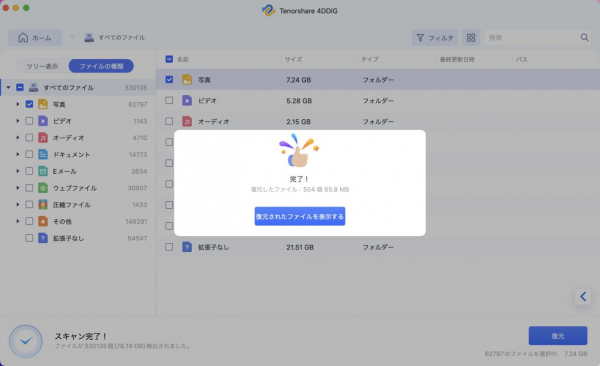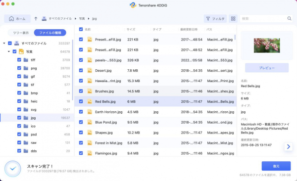 対象の必要なファイルが出てきたら、そのファイルを選択して「復元」をクリックしてください。写真・動画・電子メール・文書など1000以上のファイル種類を復元できます。また、SDカードや外付けHDD様々なデバイスのデータを復元できます。Mac、Windows両方に対応しています。どんな状況でデータが失われてもふくげんできます。Tenorshare 4DDiGデータ復元ソフトがあれば、安心です。