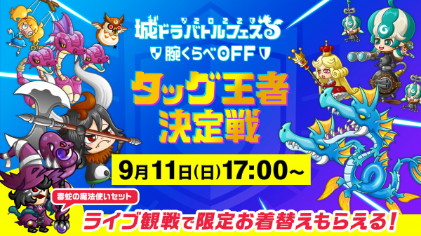 9月11日(日)17時より、「城ドラバトルフェス2022」のタッグ王者決定戦が開催!決定戦の様子は城とドラゴンYouTube公式チャンネルでライブ配信され、観覧特典としてゲーム内の魔法使い限定お着替え「毒蛇の魔法使いセット」の配布もあるので、ぜひ生放送を視聴して手に入れましょう!