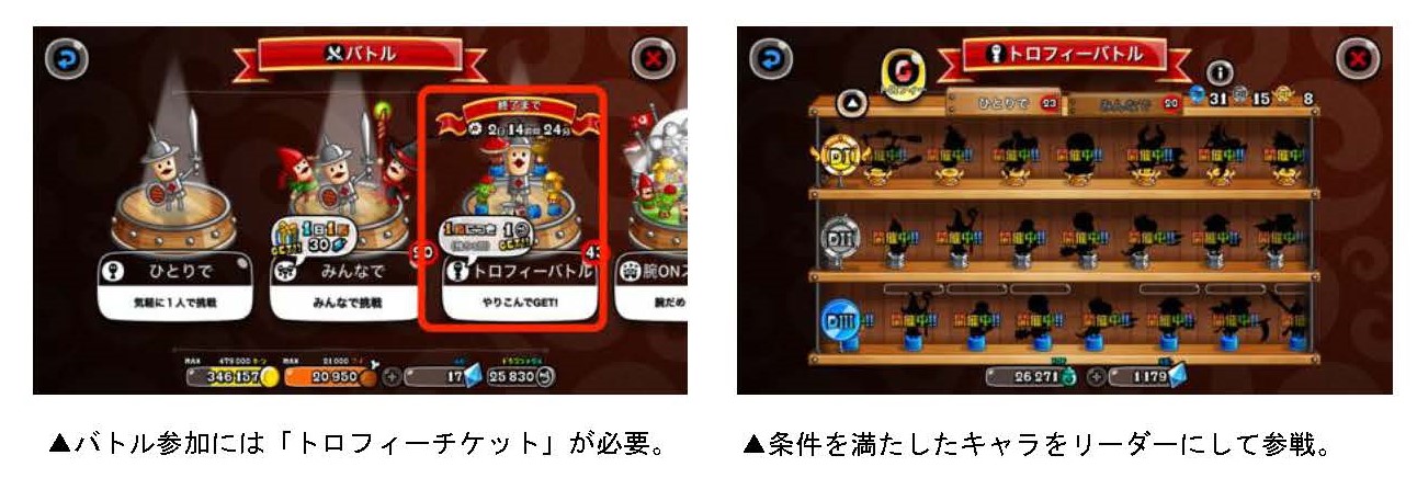 トロフィーバトルは、出場条件を満たしたキャラをリーダーにして戦い、“トロP”を獲得することが目的のバトルです。一定数のポイントがたまると、さまざまな報酬のほか、キャラの能力値が上昇する“D1武具”などが入手できます。