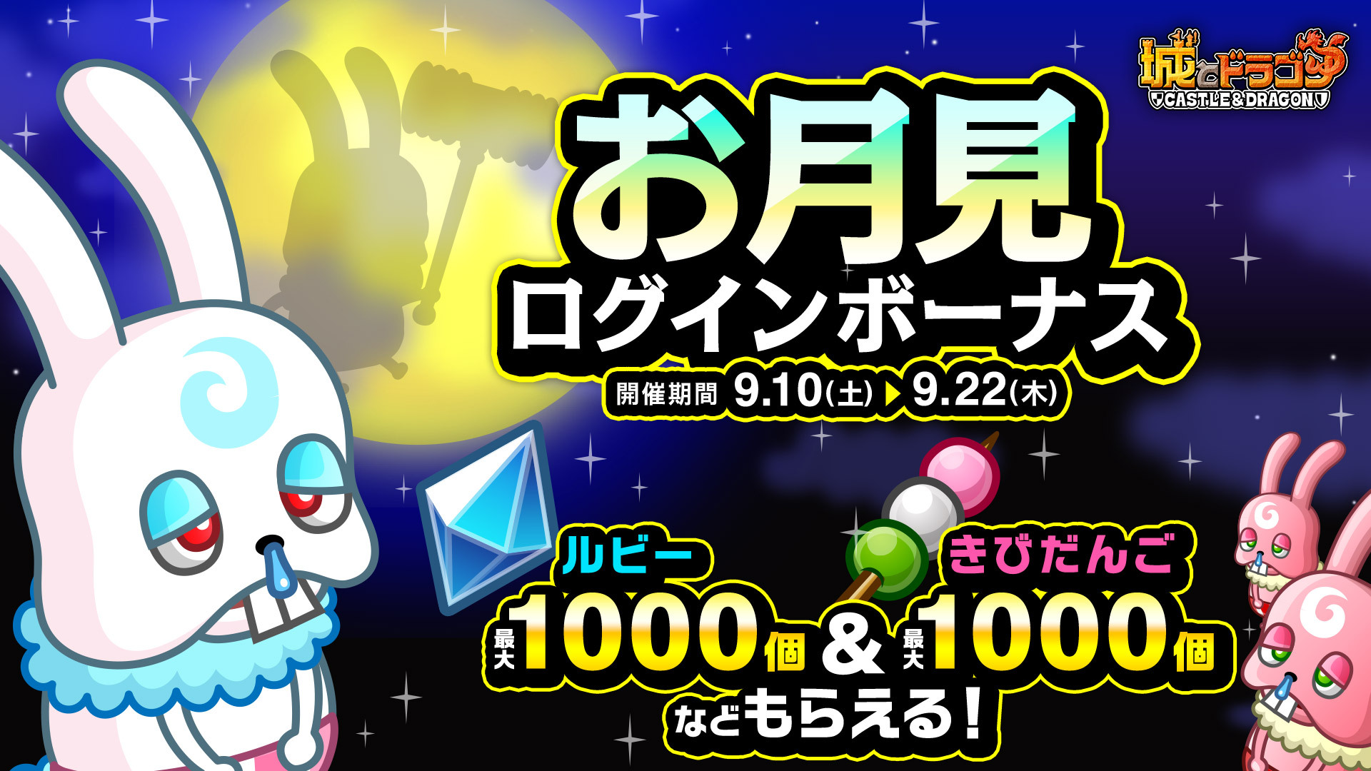 9月10日(土)より、ゲームにログインすると、最大で1000ルビーやきびだんご1000個などがもらえる「お月見ログインボーナス」を開催します。報酬は期間中1日1回、最大で13日間プレゼントされます。