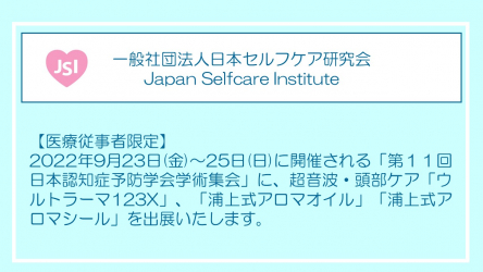 一般社団法人日本セルフケア研究会は、2022年9月23日(金)~25日(日)に開催される「第11回日本認知症予防学会学術集会」に、超音波・頭部ケア「ウルトラーマ123X」、「浦上式アロマオイル」「浦上式アロマシール」を出展いたします。