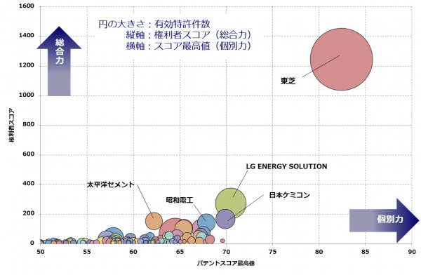 総合力1位は2016年時の調査と同様に東芝で、今回の結果では2位以下との差がより大きくなりました。同社の注目度の高い特許としては、「炭酸リチウムまたは水酸化リチウムからなるリチウム化合物を含むLTO負極」が挙げられます。