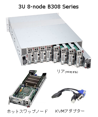 B308シリーズは、奥行き59cmの3Uシャーシに、ホットプラグ機能を備えた8台のCPUノードと、各ノードで共用する大容量(1+1)リダンダント電源を搭載したブレードサーバーです。