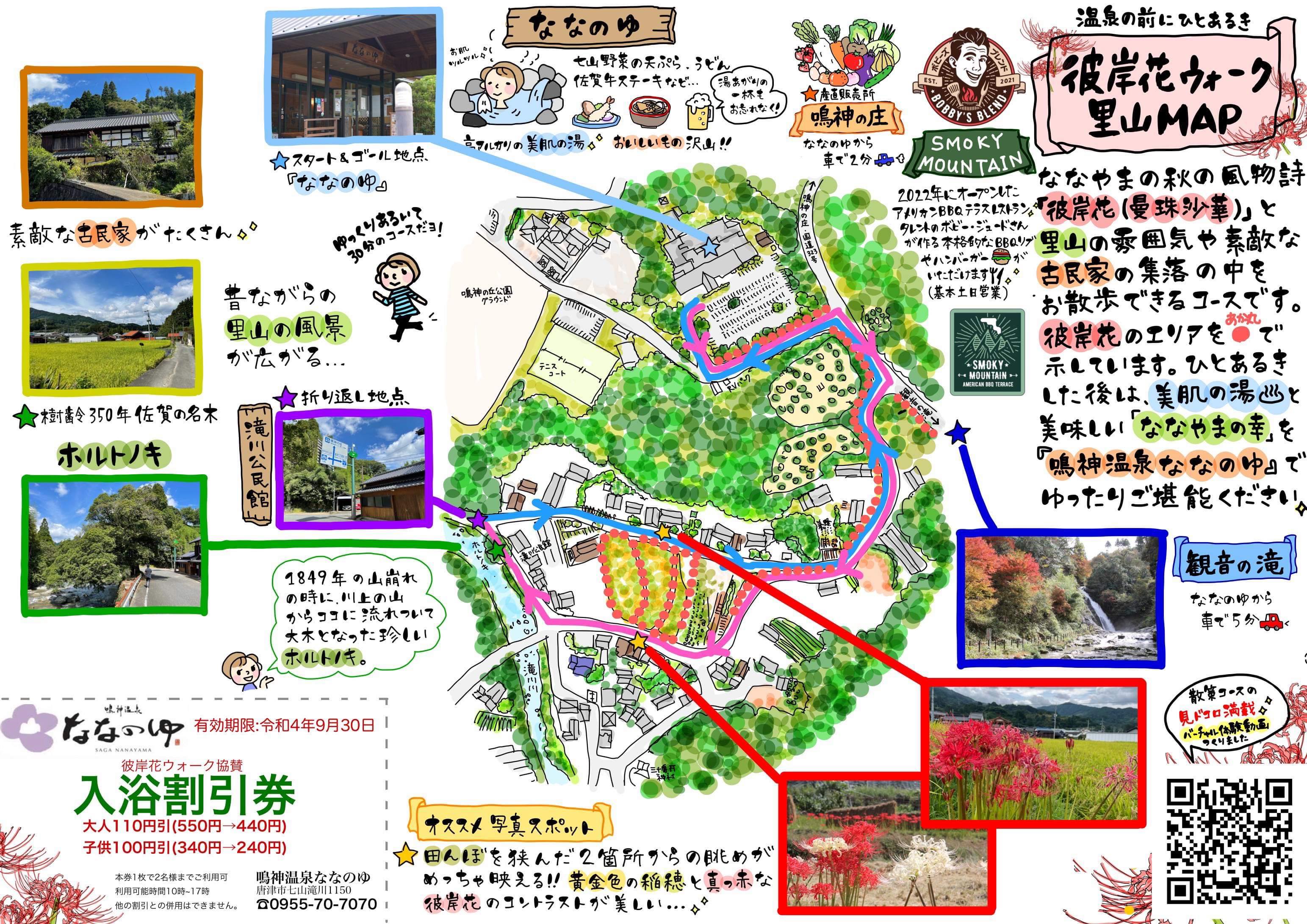 株式会社鳴神温泉(佐賀県唐津市 代表取締役 岩村俊武)が佐賀県唐津市七山地区で運営する日帰り温浴施設「ななのゆ」(支配人 鬼塚晃)は、入浴割引クーポン付き「彼岸花ウォーク里山MAP」を9月12日から配布スタートしました。