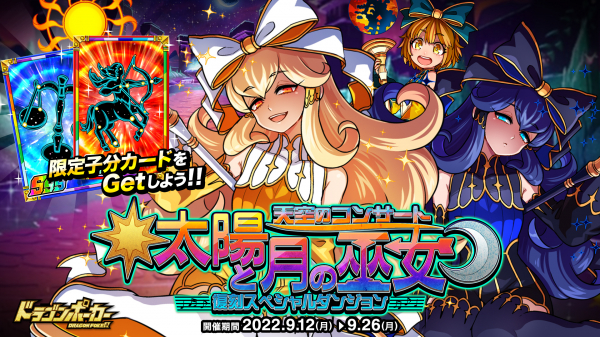 株式会社アソビズム(本社:東京都千代田区、代表取締役:大手智之)は、App Store・Google Playにて好評配信中のリアルタイム合体カードバトル『ドラゴンポーカー』で、2022年9月12日(月)より復刻スペシャルダンジョン「太陽と月の巫女 天空のコンサート」を開催いたします。
