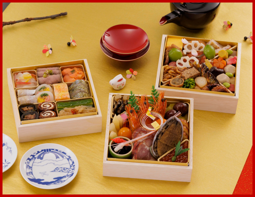 山海の食材を彩り良く重ねて丁寧に盛り合わせ、お正月にふさわしい華やかな祝い膳となっております。季節感あふれる美しい盛り付けもお楽しみください。』