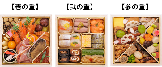 壱の重は、お正月にふさわしい祝い肴を中心に縁起物の食材を丁寧に盛り込み、新年を迎える喜びを華やかに表現しました。弐の重は、あっさりと召し上がっていただけるような酸味と甘味をバランスよく詰め合わせ、色彩豊かなお重に仕上げました。参の重は、毎年新しい食材を取り入れ、焼き物、煮しめなど24種類の山海の幸を盛り沢山に詰合せ、食べ応えのあるお重です。