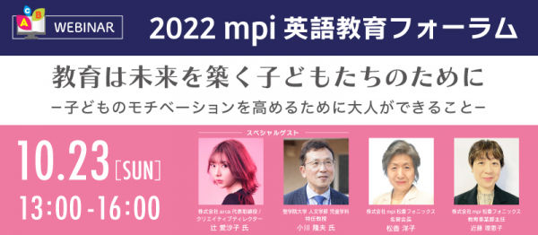 英語教育43年の株式会社mpi松香フォニックス(創立:1979年、代表者:竹村千栄子、以下mpi)は、英語教育に携わる方や、子どもに英語を教えたい保護者を対象に「2022 mpi 英語教育フォーラム 教育は未来を築く子どもたちのために - 子どものモチベーションを高めるために大人ができること-」を10月23日(日)にオンラインで開催いたします。