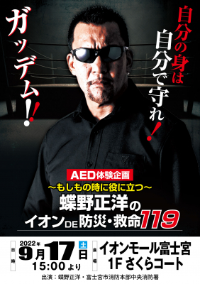 一般社団法人ニューワールドアワーズスポーツ救命協会代表理事で日本消防協会・消防応援団ならびに日本AED財団・AED大使を務める蝶野正洋さんが、9月17日(土)15:00より、イオンモール富士宮1Fさくらコートで、富士宮市消防本部中央消防署協力のもと開催される『AED体験企画~もしもの時に役に立つ~蝶野正洋のイオンDE防災・救命119』に出演します(観覧無料)。是非、ご参加ください。