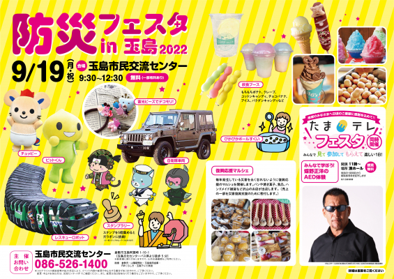 『防災フェスタin玉島2022』は参加無料(一部有料あり)で、防災に関する展示やワークショップ、復興応援マルシェなど、家族で防災を学びながら楽しく過ごせるイベントで、9:30~12:30まで開催されます。