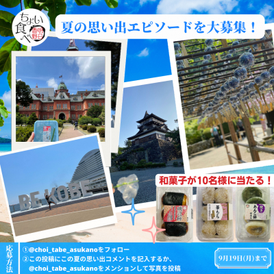 ちょい食べ明日香野アカウントをメンションして写真を投稿していただくことでも応募が可能です。あなたの大切な「夏の思い出」エピソードをぜひ、ご応募ください。