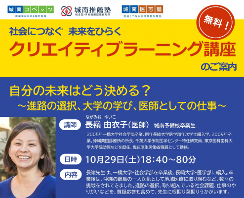 株式会社城南進学研究社(本社:神奈川県川崎市、代表取締役社長CEO:下村勝己)は、2022年10月29日(土)、新しい価値観・世界観を創造する力を鍛える「クリエイティブラーニング講座」に医師の長嶺由衣子氏を招き、「自分の未来はどう決める?~進路の選択、大学の学び、医師としての仕事~」をオンラインで開催いたします。
