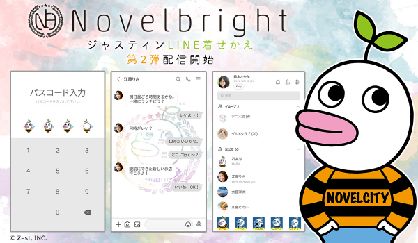 インクルーズより先行配信した記念すべきLINE着せかえ第一弾はLINEクリエイターズ着せかえランキングで1位を獲得し、追って、販売されたLINEスタンプも大好評を博したNovelbright公式キャラクター「ジャスティン」。
