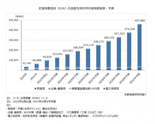 株式会社矢野経済研究所(代表取締役社長:水越孝)は、2022年の定置用蓄電池(ESS)世界市場を調査し、設置先別及び需要分野別、電池種別の動向、参入企業動向、将来展望を明らかにした。