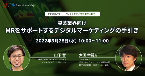 株式会社パワー・インタラクティブは、アドビ株式会社と、『【製薬業界向け】MRをサポートするデジタルマーケティングの手引き』(無料)と題したオンラインセミナーを、9月28日に共催します。