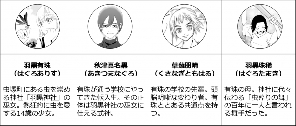 因縁渦巻く虫塚町に暮らす、14歳の少女・羽黒有珠。虫を崇める神社の巫女として悲しい宿命を背負う彼女の前に、ある日、背中にトンボの羽を生やした転校生が出現!?