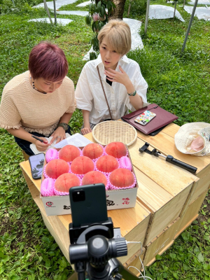 今回も、地方を盛り上げる一環として、青森県平川市のきむら果樹園にうかがい、果汁たっぷりの桃を中心とした地元の特産品をライブコマースで販売しました。