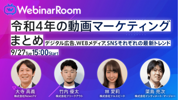 ビジネスマンの役に立つ動画がいつでも無料で観られるウェビナープラットフォーム「Webinar Room(ウェビナールーム)」(https://webinar-room.net/)を運営する株式会社ヒトクセは、2022年9月27日(火)15:00~に株式会社NewsTV、株式会社フリークアウト、株式会社フルスピード、株式会社インティメート・マージャーとの”令和4年の動画マーケティングまとめ~デジタル広告、WEBメディア、SNSそれぞれの最新トレンド~”を開催します。