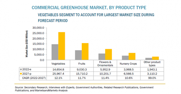商業用温室の市場規模は、2022年の355億米ドルからCAGR11.6%で成長し、2027年には616億米ドルに達すると予測されています。ガラスやプラスチック製の屋根や壁など、さまざまな種類のカバー材を提供する商業用温室は、暖房システム、冷却システム、換気システム、LED栽培ライト、通信技術、灌漑システム、制御システムなど高い成長が見込まれる新興用途で、複数の技術が使用されています。