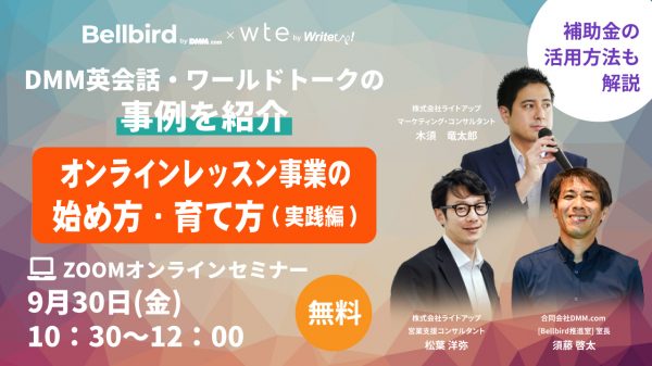 株式会社ライトアップ(本社:東京都渋谷区、代表取締役社長:白石崇、以下ライトアップ)は、合同会社DMM.com(本社:東京都港区、会長 兼 最高経営責任者(CEO):亀山敬司、以下DMM)が運営するオンラインコミュニケーションに関するOEMサービス「Bellbird by DMM」と共に、レッスン事業者向けにオンラインセミナーを開催いたします。