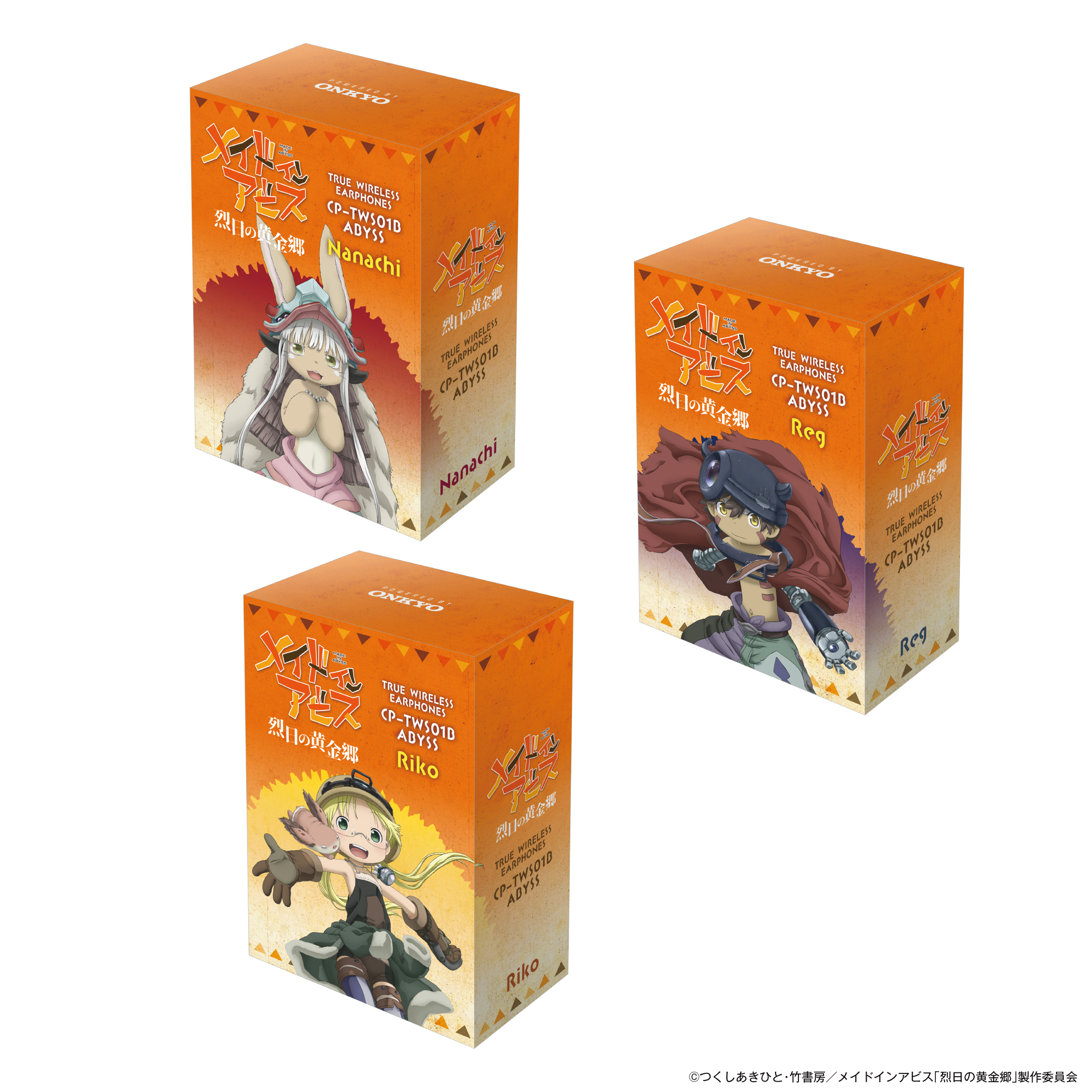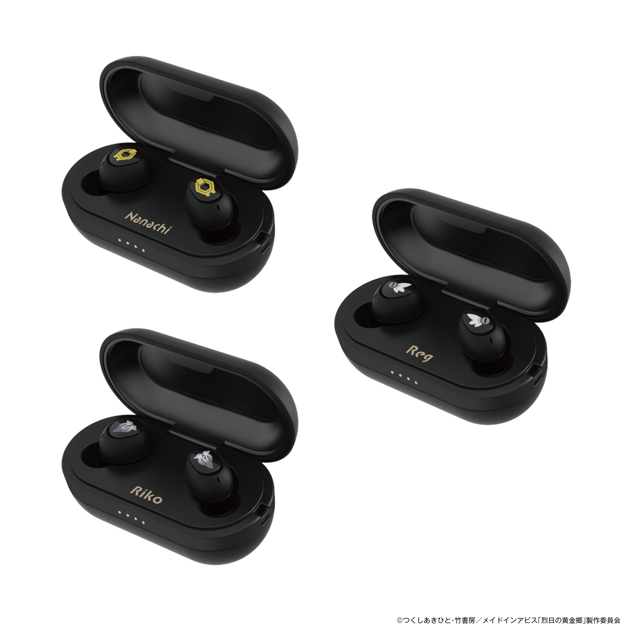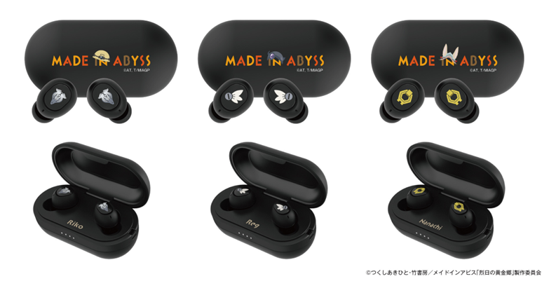 本コラボレーションモデルは「リコ」「レグ」「ナナチ」の3種類、両ハウジングにはキャラクターの象徴となるマークを印刷、充電ケースには作品タイトルを表現をしました。また内蔵ボイスは「リコ(CV:富田美憂)」、「レグ(CV: 伊瀬茉莉也)」、「ナナチ(CV:井澤詩織)」の本モデルのために録り下ろしたボイスとなっております。